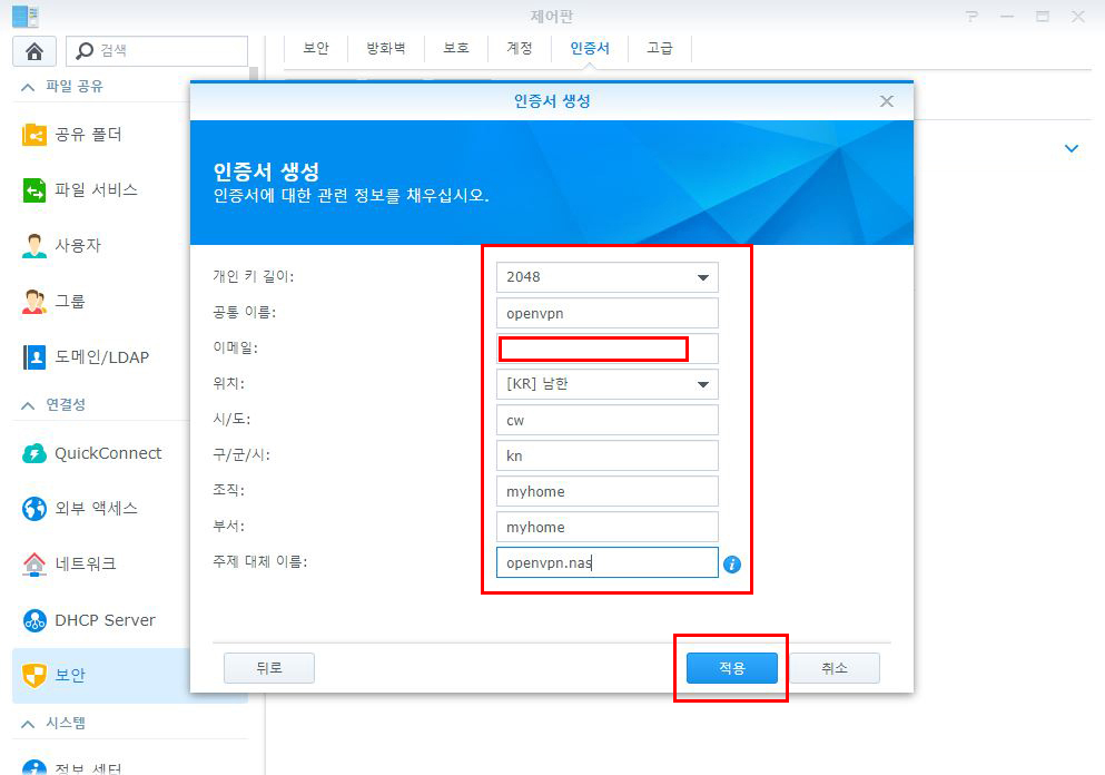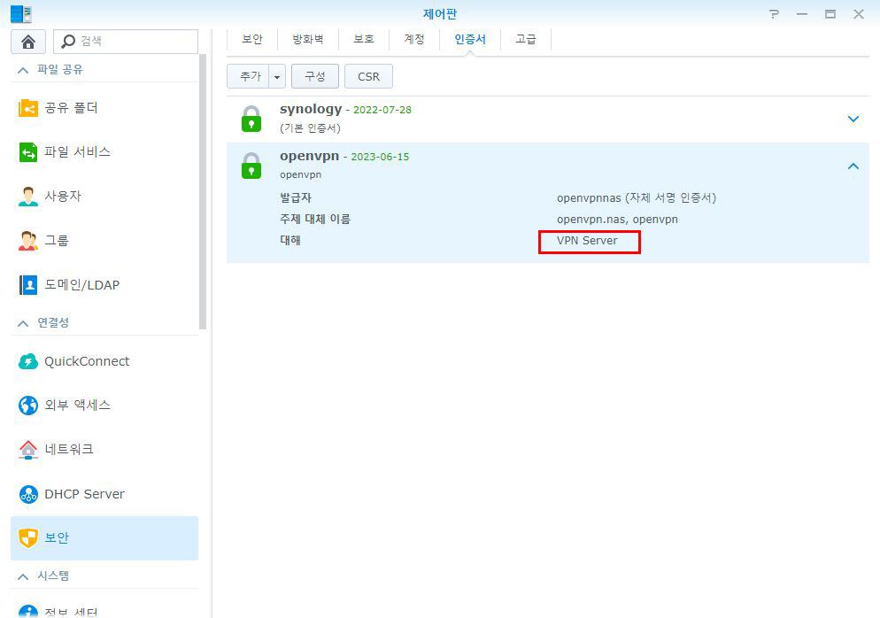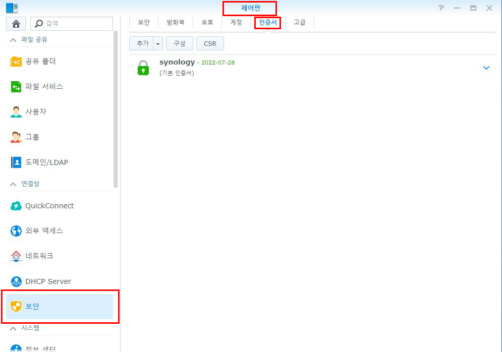 나스 제어판-보안 메뉴의 인증서 탭을 클릭