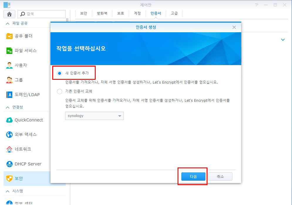 새 인증서 추가를 선택하고 ‘다음’ 을 클릭