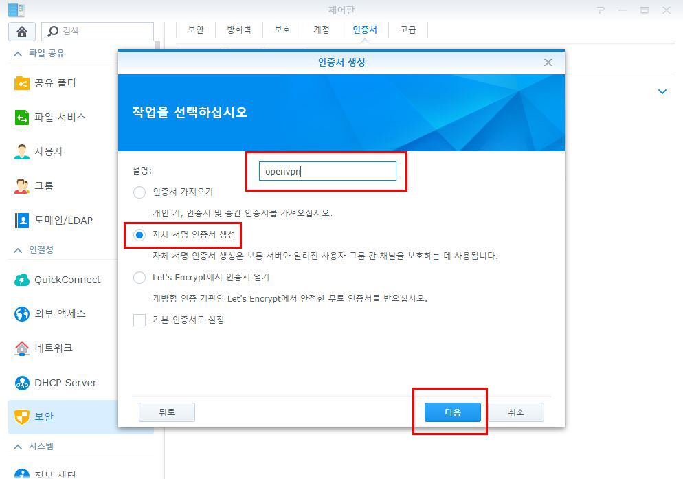 ‘자체 서명 인증서 생성’을 선택하고 설명란에 ‘openvpn’을 입력하고 ‘다음’을 클릭