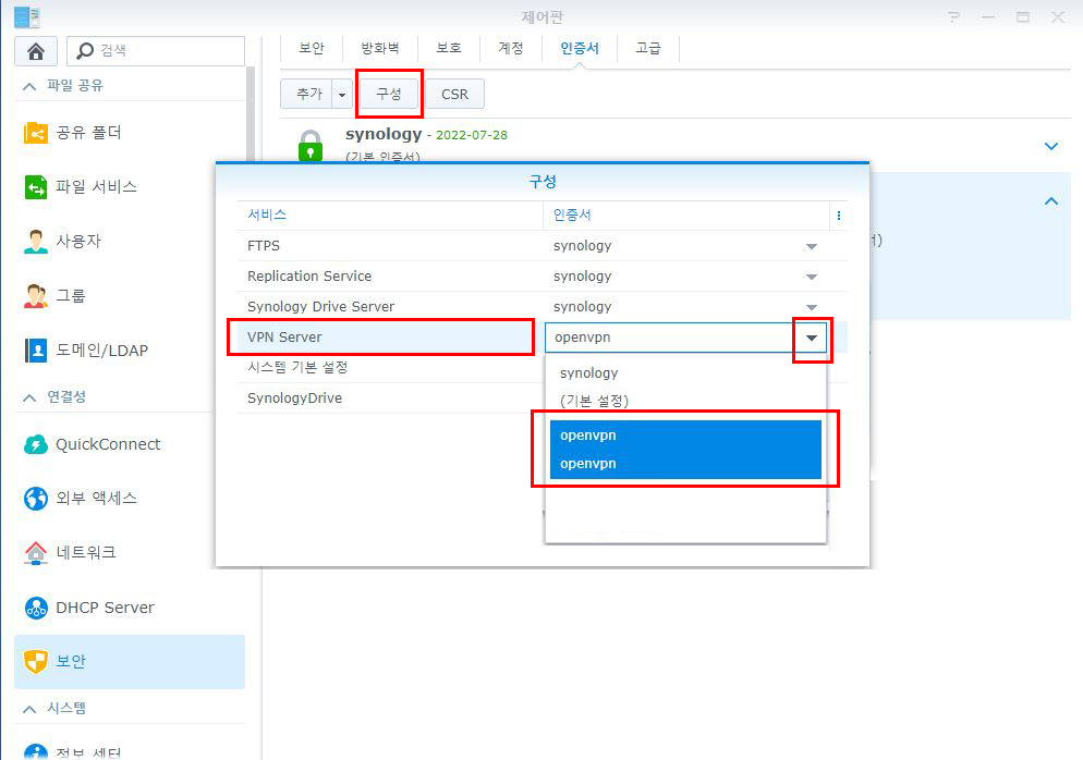 인증 중 openvpn을 선택한 후 상단의 ‘구성’을 클릭하고 VPN Server 항목의 우측에서 ‘openvpn’을 선택