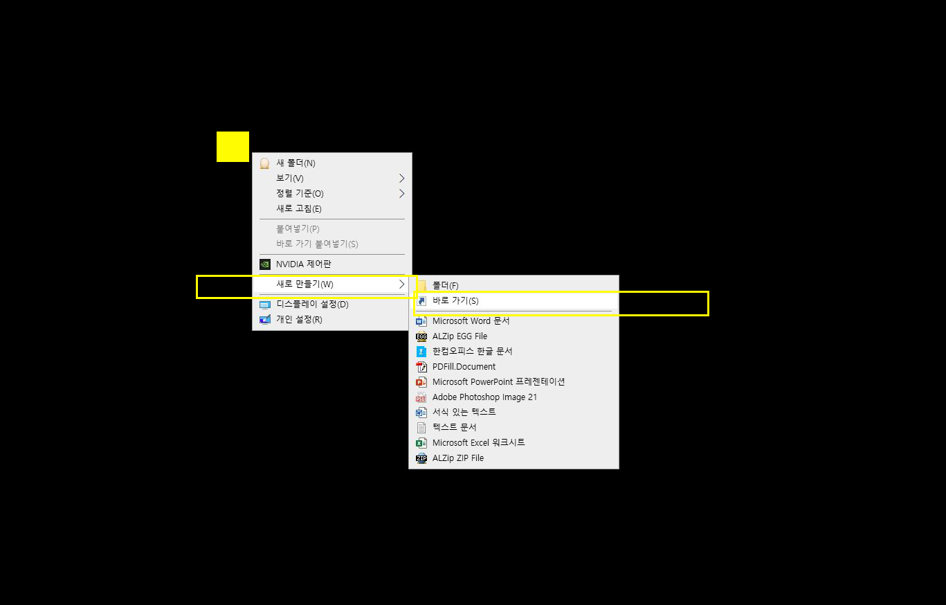 바탕화면 빈 곳에서 ‘마우스 우클릭’한 후 나오는 메뉴에서 그림과 같이 ‘바로 가기’를 클릭합니다.