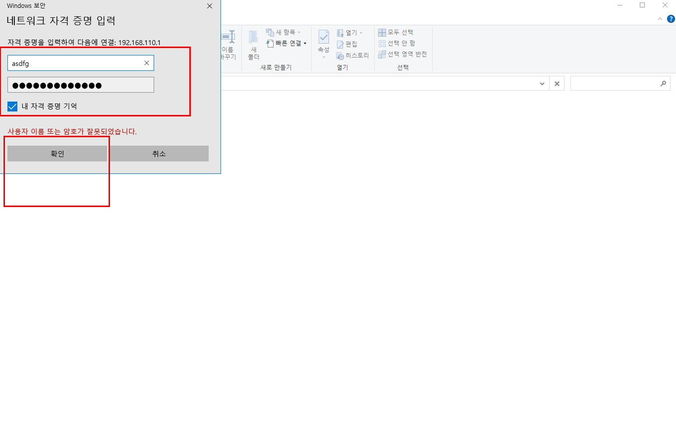 처음 접속 시 사용자, 비밀번호를 입력하고 그 아래 ‘내 자격 증명 기억’에 체크한 후 ‘확인’을 누르면 다음 접속 시에는 바로 해당 폴더로 진입니다.